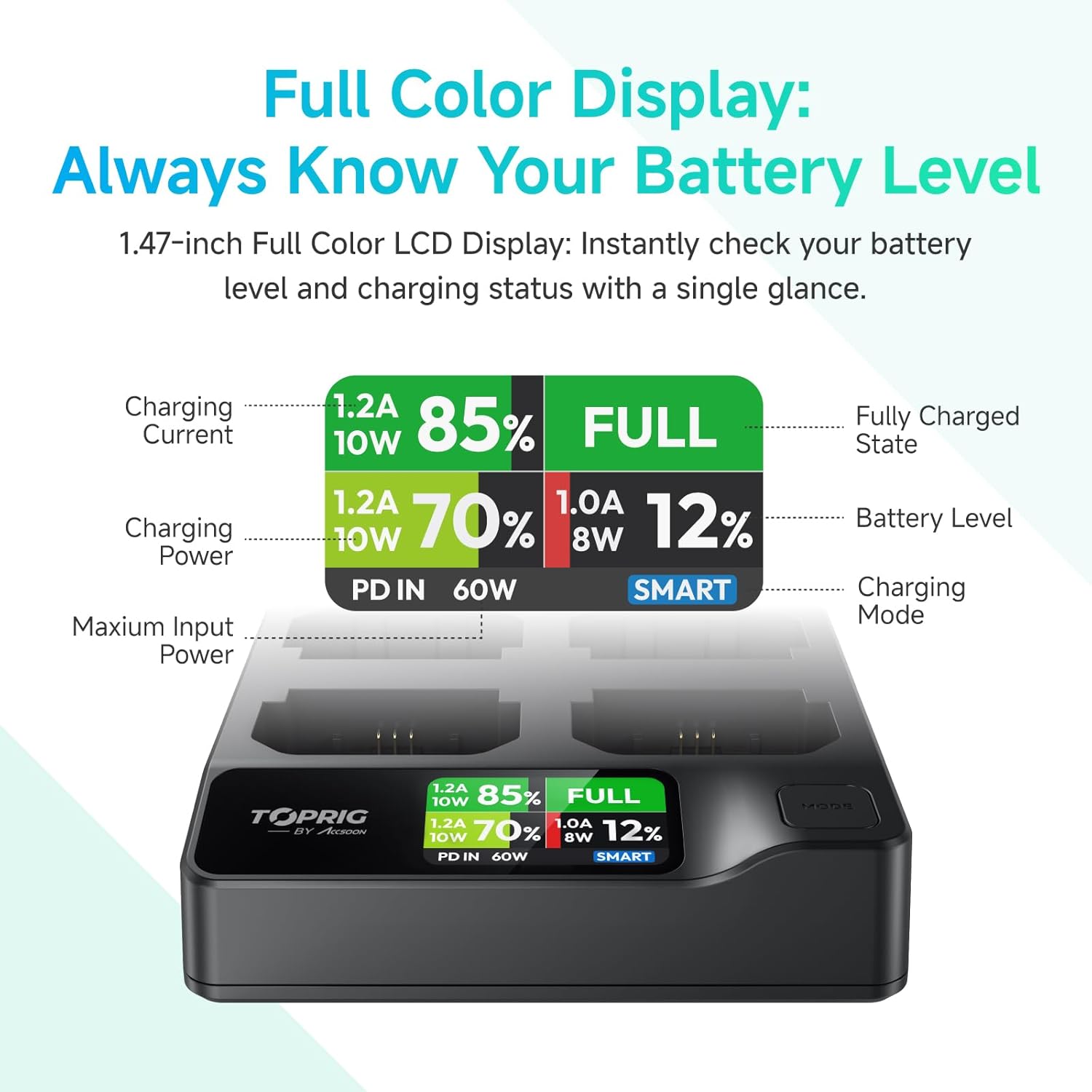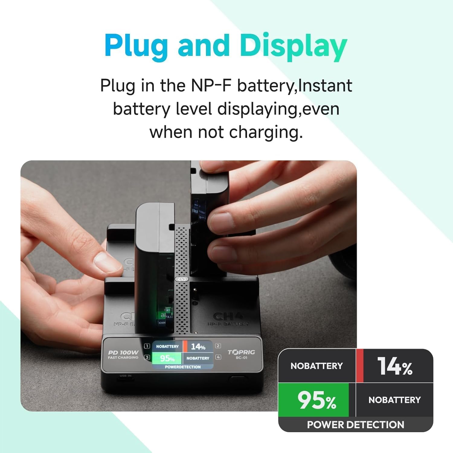 Compatible with Sony NP-F550, NP-F750, NP-F770, NP-F960, NP-F970 or other NP-F series Camera BatteriesNP-F970 battery charger equipped with a 1.47-inch display screen that will show the battery charging status in real time; When the charger is powered on, it will detect the working status of the 4 channels, you can see the precise battery power level when you plug in the batteryNP-F550 battery charger have 4 individual charging channels, it support charger 4 batteries at the same timeAutomatic battery identification, battery under-voltage activation, activate the idle battery and wakeup the battery vitalityLightweight and easy to carry, this NP-F battery charger weight is about 0.41lb, you can take it in your bag, even when you travel, you can take it with you, easily and quickly, to be your NPF battery charging station